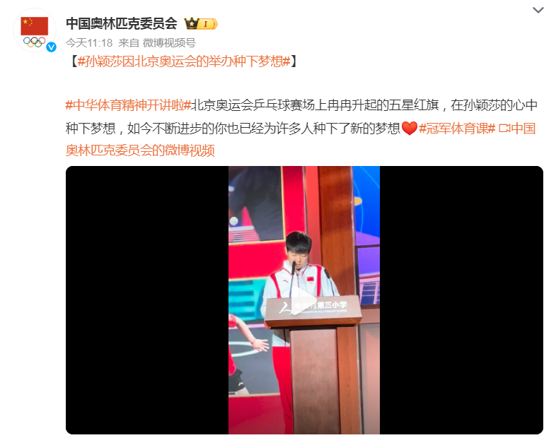 @中国奥林匹克委员会写道:北京奥运会乒乓球赛场上冉冉升起的五星红旗,在孙颖莎的心中种下梦想,如今不断进步的你也已经为许多人种下了新的梦想