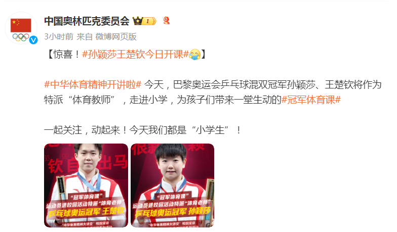 今天,巴黎奥运会乒乓球混双冠军孙颖莎、王楚钦将作为特派“体育教师”,走进小学,为孩子们带来一堂生动的冠军体育课
