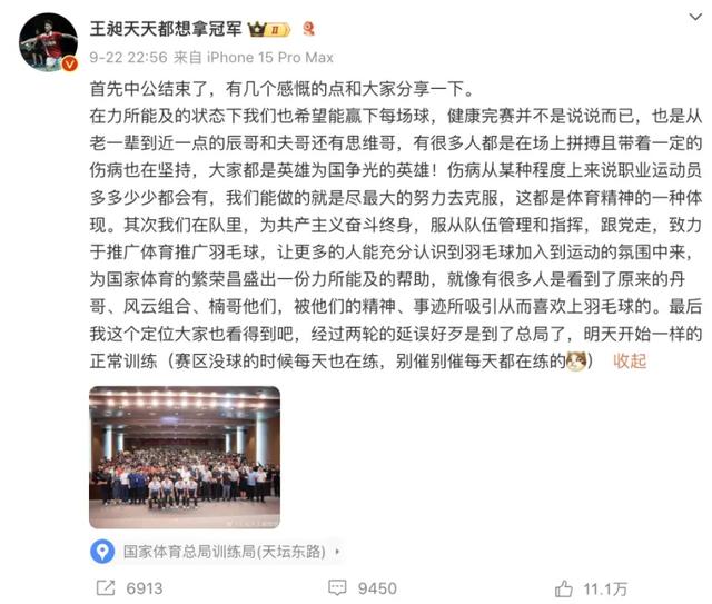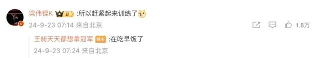 9月23日早上,王昶队友梁伟铿在其评论区留言,让他赶紧起来训练,王昶则回应称“在吃早饭了”。