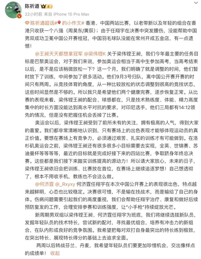 9月23日,“梁王组合”梁伟铿、王昶的教练陈其遒发文谈两人近期表现。