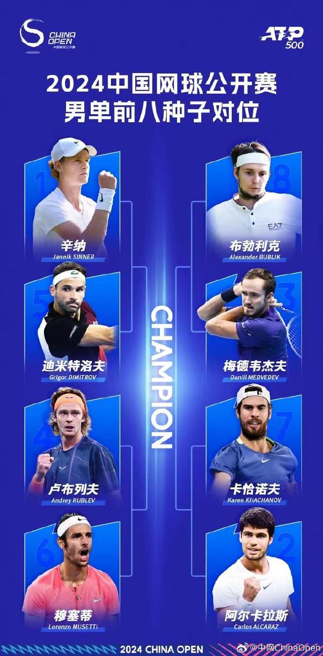 9月24日下午,2024中国网球公开赛男单抽签仪式在红土花园举行,世界第一、卫冕冠军辛纳出席,他和另外3位种子选手卢布列夫、迪米特洛夫、穆塞蒂同分在了上半区,下半区的种子则有阿尔卡拉斯、梅德韦杰夫、卡恰诺夫和布勃利克,两位中国选手商竣程和布云朝克特将在首轮遭遇,他们和张之臻同处上半区,另一位中国选手周意则独处下半区。