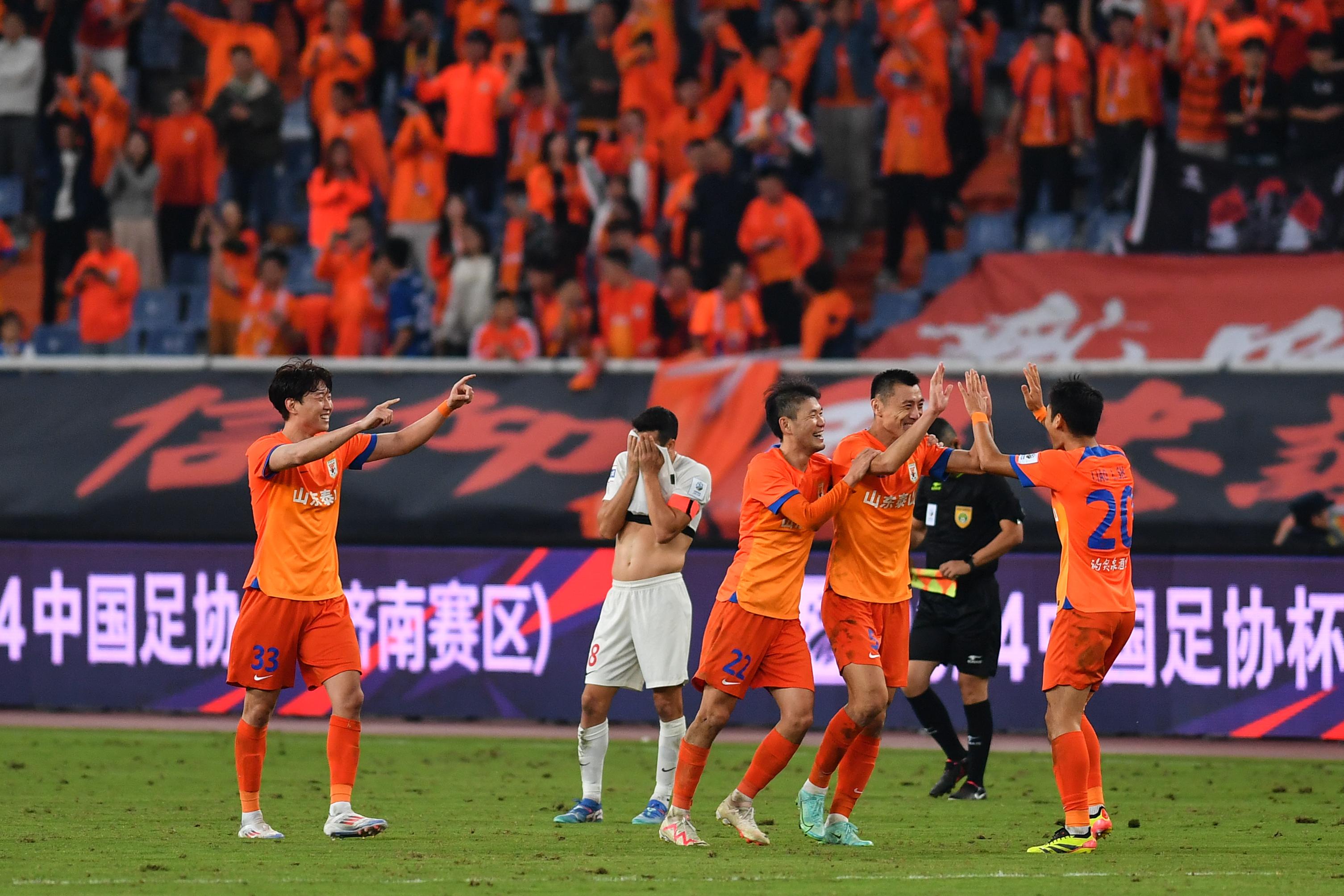 9月24日,山东泰山队球员庆祝比赛获胜。 新华社记者 朱峥 摄