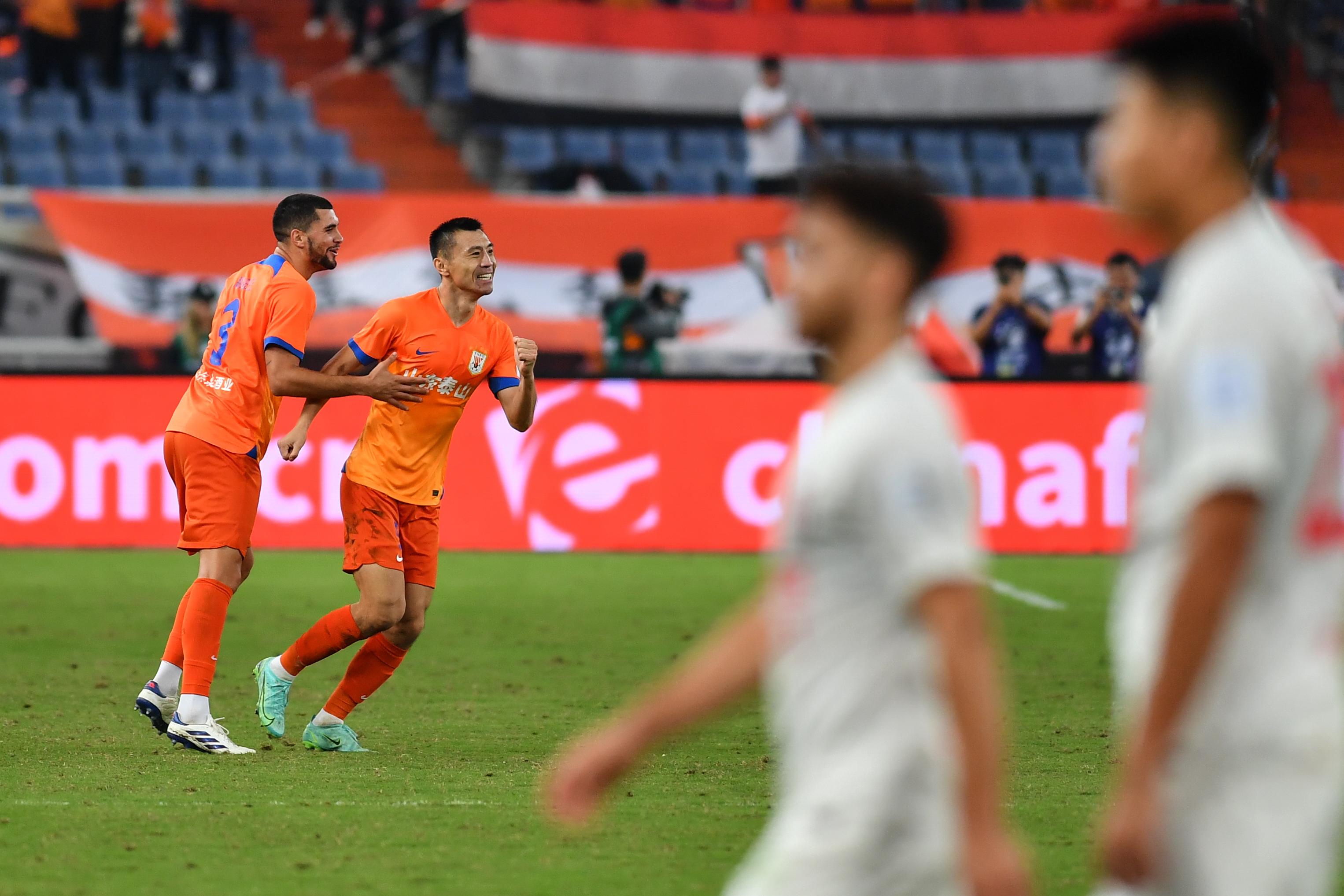 9月24日,山东泰山队球员郑铮(左二)在比赛中庆祝进球。 新华社记者 朱峥 摄