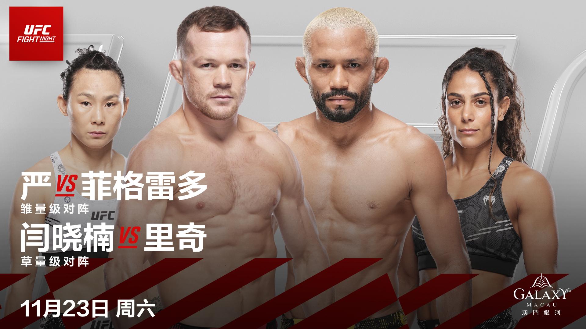 当晚头条主赛将由两位当今世界顶级的雏量级高手领衔——前UFC雏量级冠军、官方排名第3的俄罗斯选手彼得·严对战前UFC蝇量级冠军、官方排名第5的巴西选手戴维森·菲格雷多。拥有1/4中国血统的彼得·严具备出色的打击能力和侵略性,以17胜5负(7次KO,1次降服获胜)长期处于UFC雏量级排名头部;菲格雷多职业战绩24胜3负1平(9次KO,9次降服获胜),这场比赛被他视为赢得第二个量级UFC冠军腰带的良机。