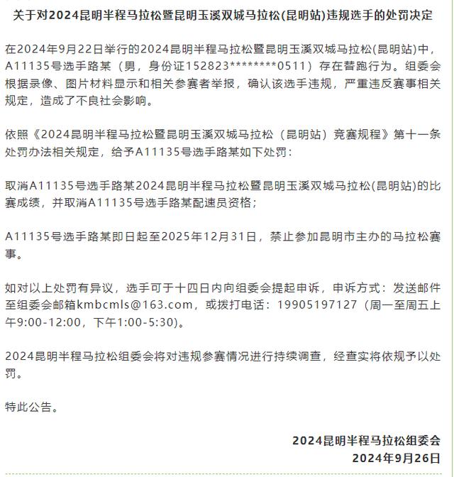 在2024年9月22日举行的2024昆明半程马拉松暨昆明玉溪双城马拉松(昆明站)中,A11135号选手路某(男,身份证152823********0511)存在替跑行为。组委会根据录像、图片材料显示和相关参赛者举报,确认该选手违规,严重违反赛事相关规定,造成了不良社会影响。