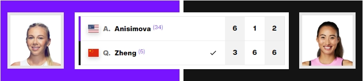决胜盘郑钦文接连破掉对手3个发球局,取得5-1的领先,随后阿尼西莫娃第七局保发,第八局郑钦文在自己的发球胜赛局中错过3次赛点,第4个赛点成功拿下最终实现逆转。