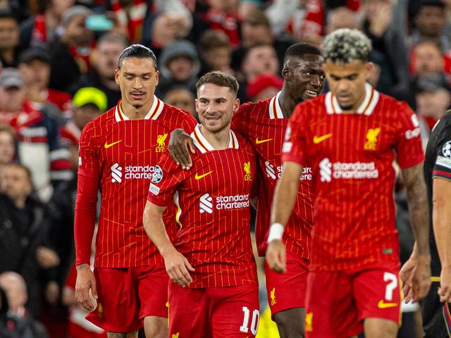 10月2日,利物浦队球员麦卡利斯特(左二)进球后与队友庆祝。新华社发