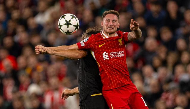10月2日,利物浦队球员麦卡利斯特(右)在比赛中争顶。新华社发