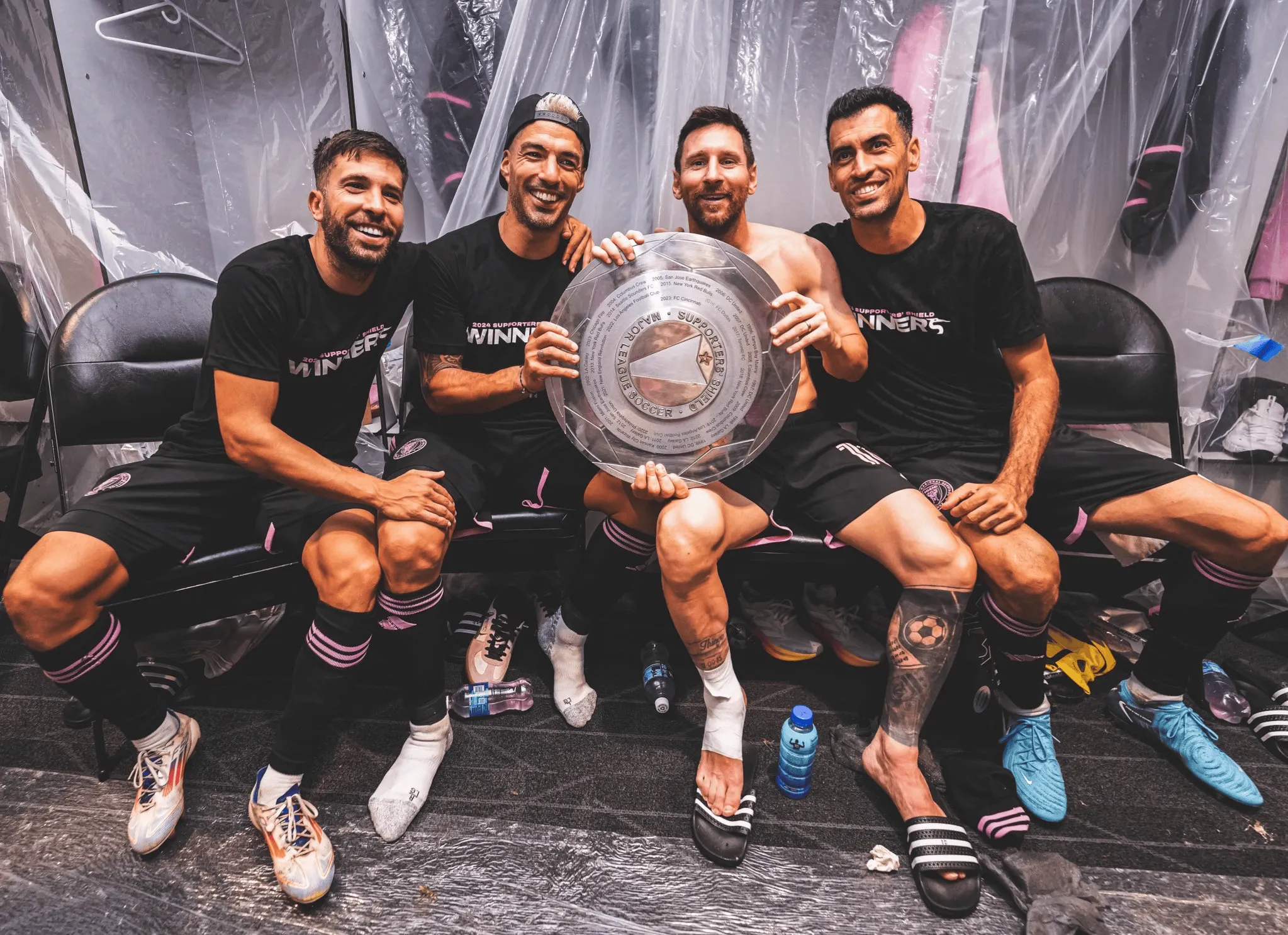 在夺冠后,梅西、阿尔巴、苏亚雷斯、布斯克茨四人在更衣室内一同与支持者盾冠军合照。