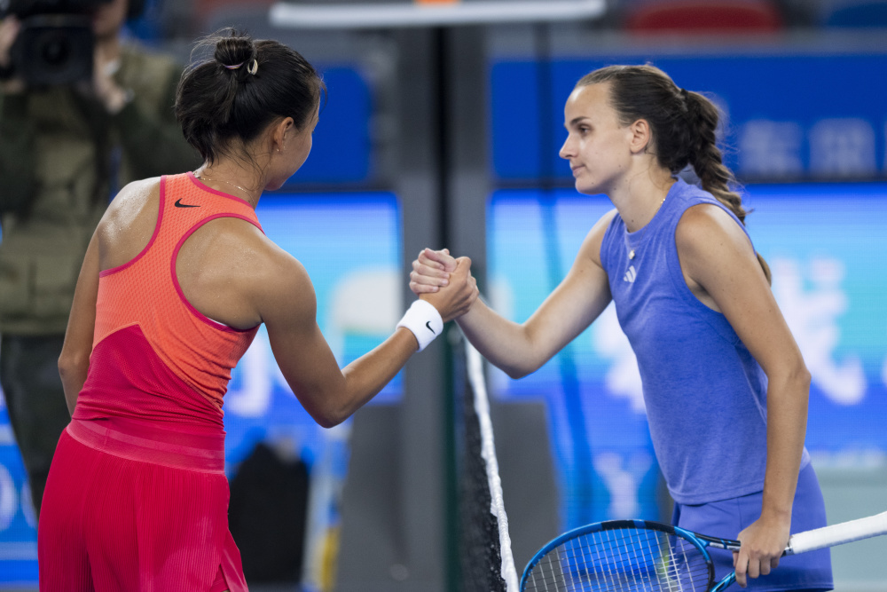 10月7日,袁悦(左)和比雷尔在比赛结束后互相致意。新华社记者 伍志尊 摄