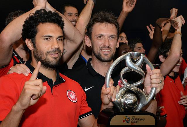 2014年11月3日,时任西悉尼流浪者队主教练托尼·波波维奇(前右)与队长尼古拉·托波尔-斯坦利手举亚冠奖杯庆祝。新华社发/法新俗话说