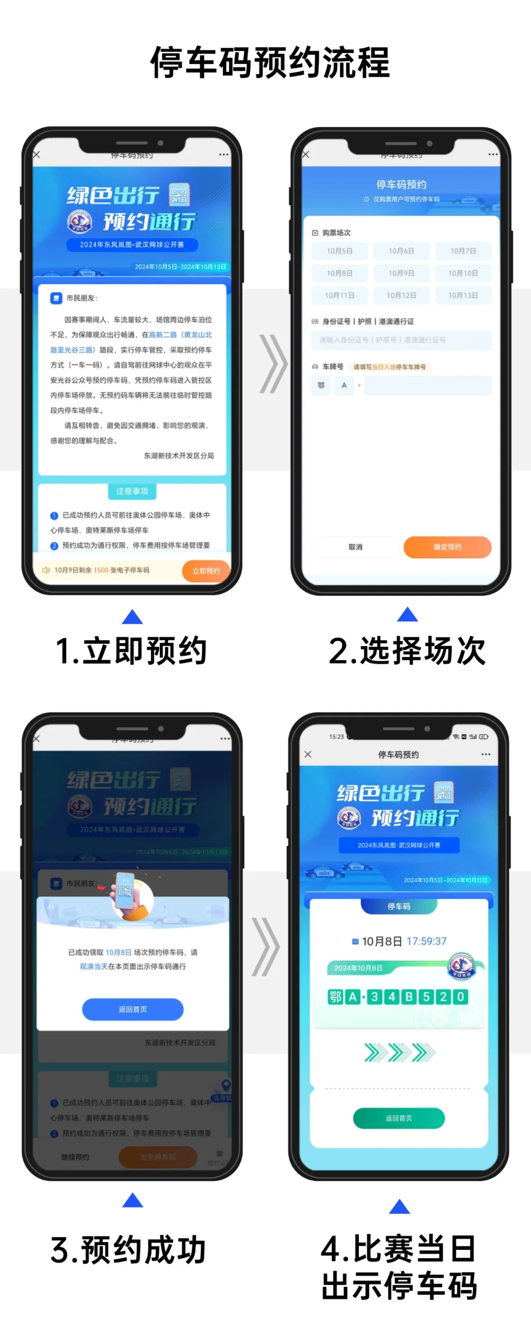 距离较近的3个停车场,需要提前预约(预约程序附后),一车一码:分别是光谷奥林匹克公园停车场(车位550个)、湖北省奥体中心停车场(车位400个)、武汉首创奥特莱斯停车场(车位500个)。