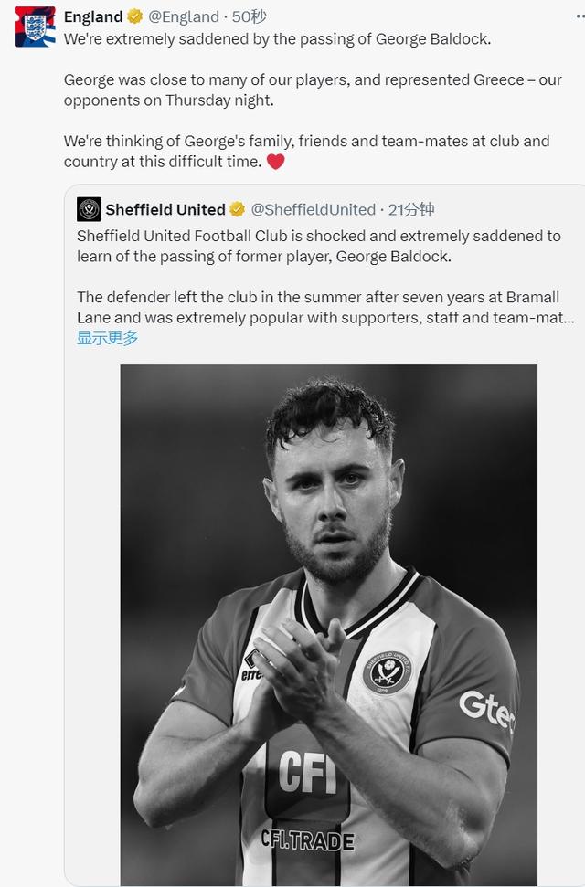 英格兰队发表声明称:“鲍多克的离世让我们深感悲痛。他与我们的许多球员关系密切,周四晚上代表希腊队出战,希腊队是我们的对手。在这个艰难的时刻,我们惦记着鲍多克的家人、朋友以及俱乐部和国家的队友。”