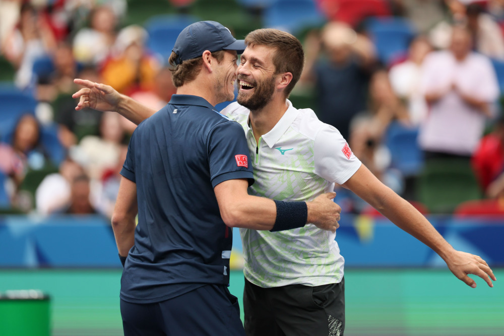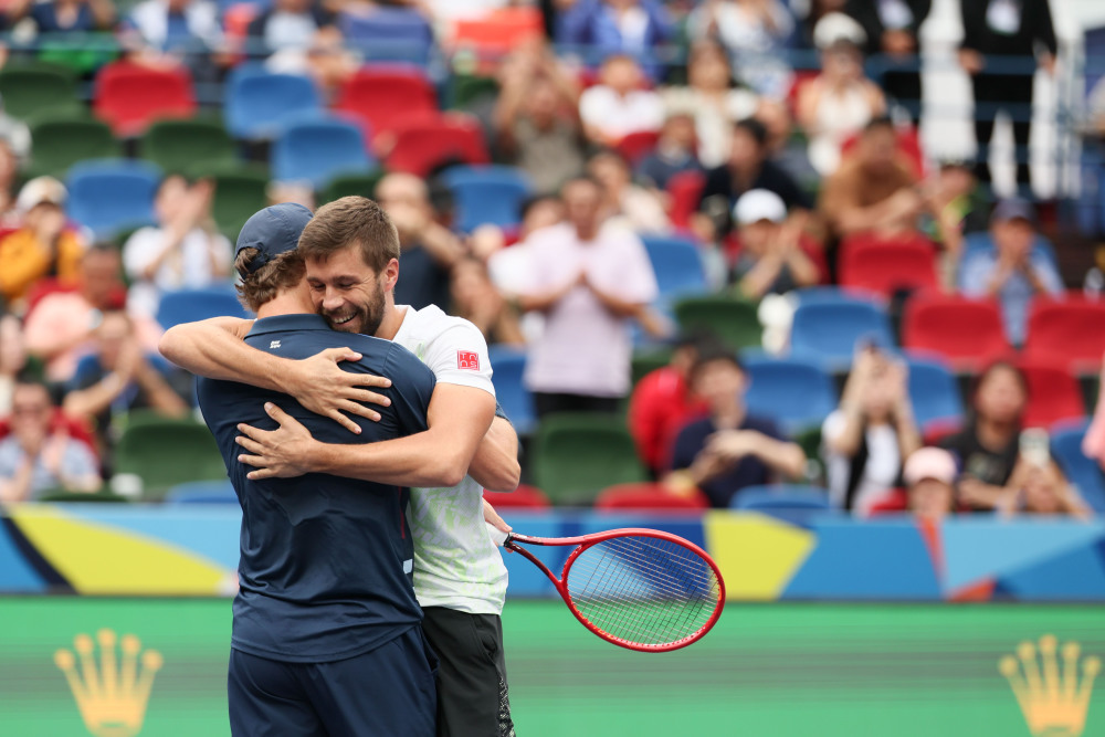 10月13日,库尔霍夫(左)/麦克蒂奇在比赛后拥抱。新华社记者 王翔 摄