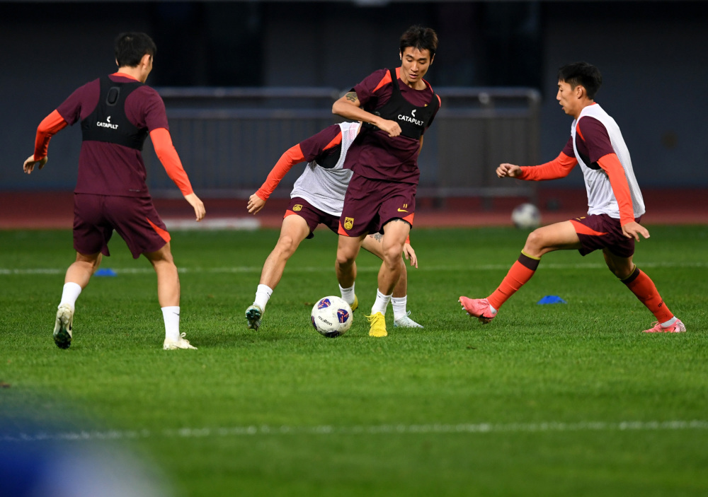 当日,中国国家男子足球队在青岛国信体育场进行赛前训练。中国队将在10月15日举行的2026年世界杯亚洲区预选赛18强赛C组第四轮比赛中对阵印度尼西亚队。