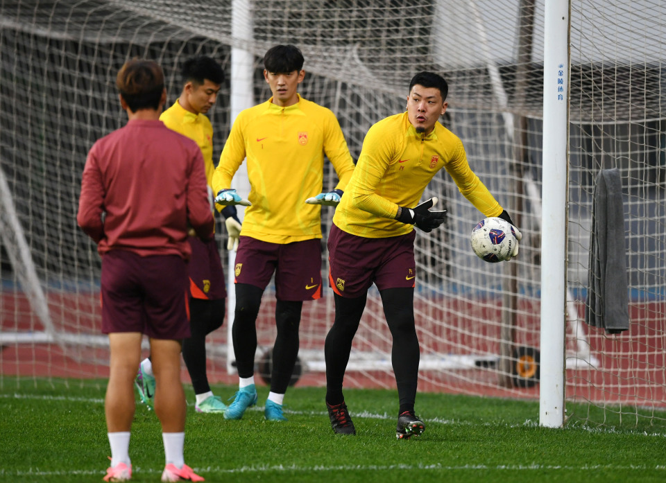 10月13日,中国队守门员王大雷(右一)在训练中。新华社记者 李紫恒 摄