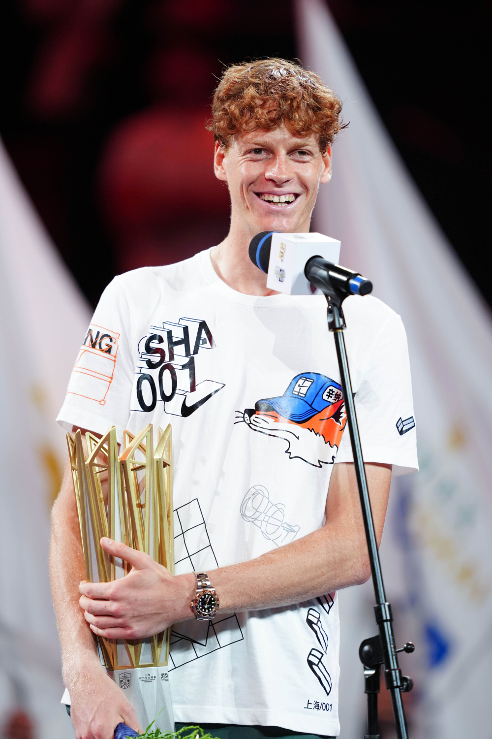 10月13日,辛纳在颁奖仪式上捧杯。新华社记者 白雪飞 摄