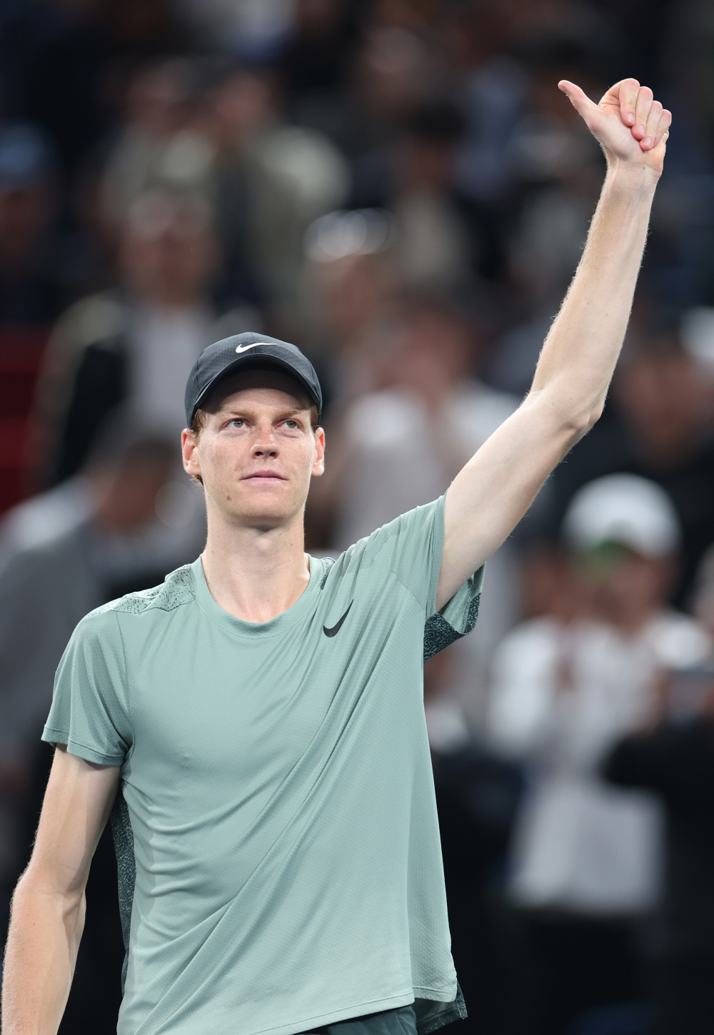10月13日,辛纳在比赛后庆祝。新华社记者 白雪飞 摄