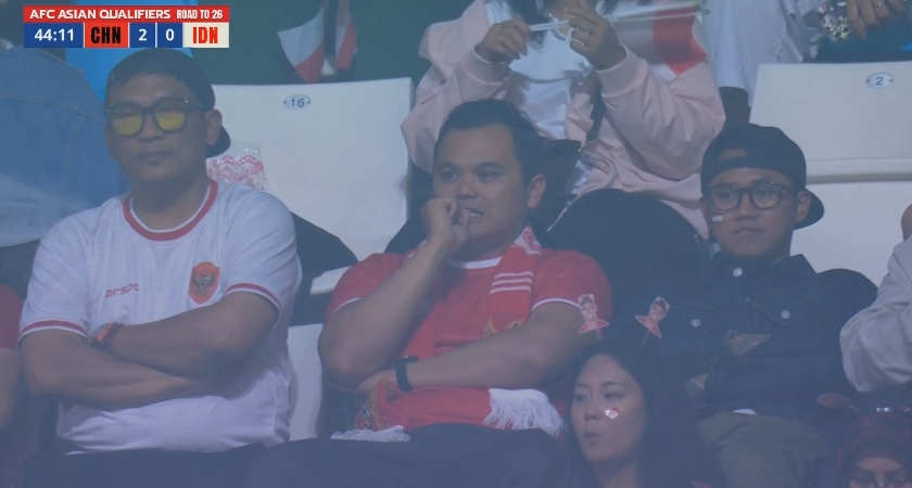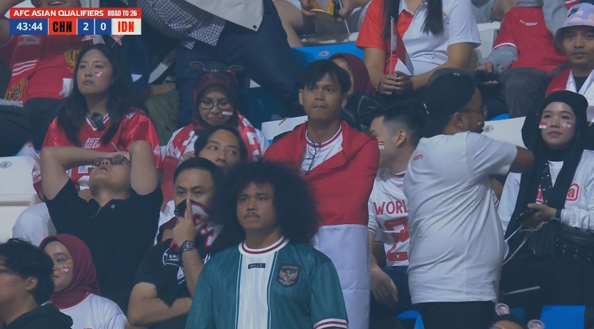 印尼球迷场边一脸沮丧,抱头仰面。