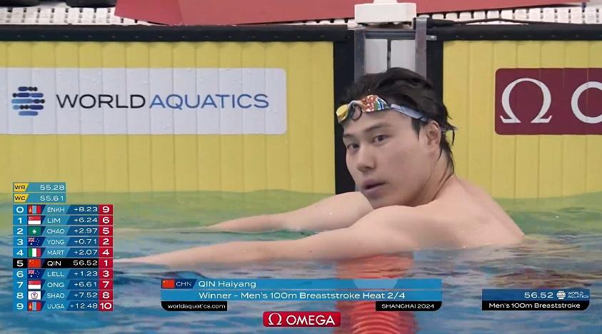 10月18日上午,2024世界泳联游泳世界杯上海站比赛在上海东方体育中心开赛。在男子100米蛙泳预赛中,覃海洋以56秒52的成绩排名所有选手第一位,晋级将于10月18日晚进行的决赛。