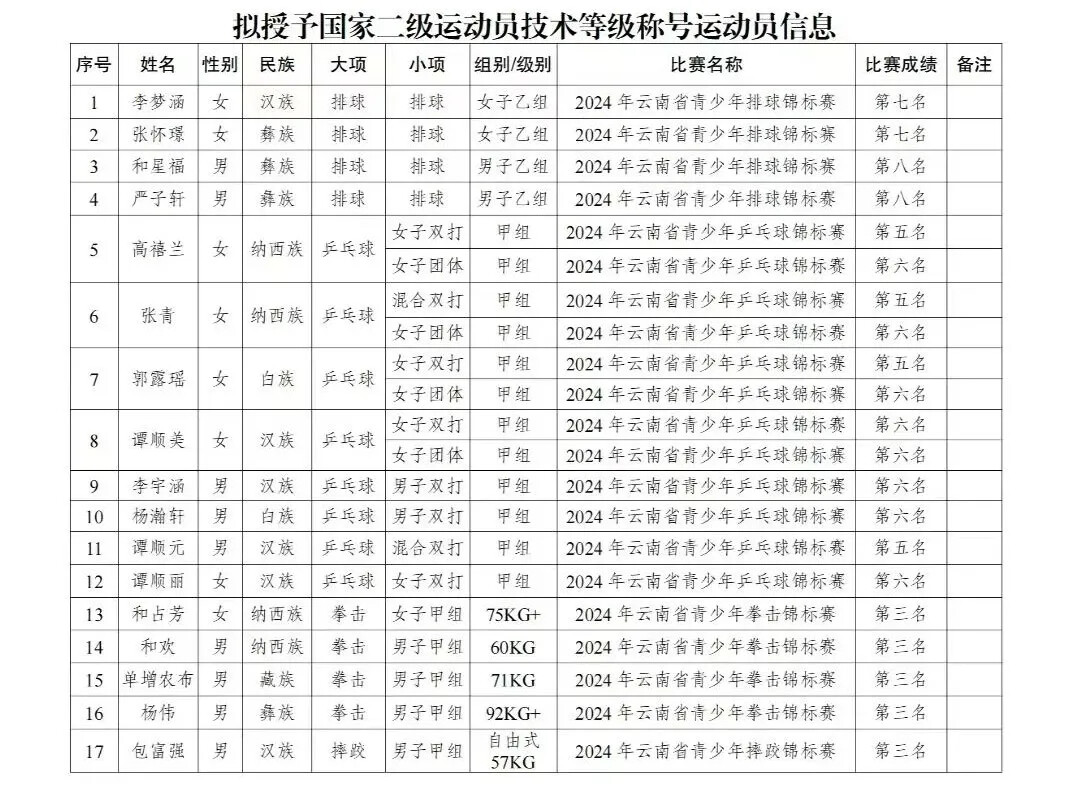 10月15日,云南丽江市教体局发布关于拟授予李梦涵等17人国家二级运动员技术等级称号的公示,公示时间为2024年10月15日至23日。据悉,本批次拟授的17人,均是在云南省青少年排球、乒乓球、拳击、摔跤等项目锦标赛上获得优异的成绩,根据《运动员技术等级标准》《运动员技术等级管理办法》等相关规定获选。
