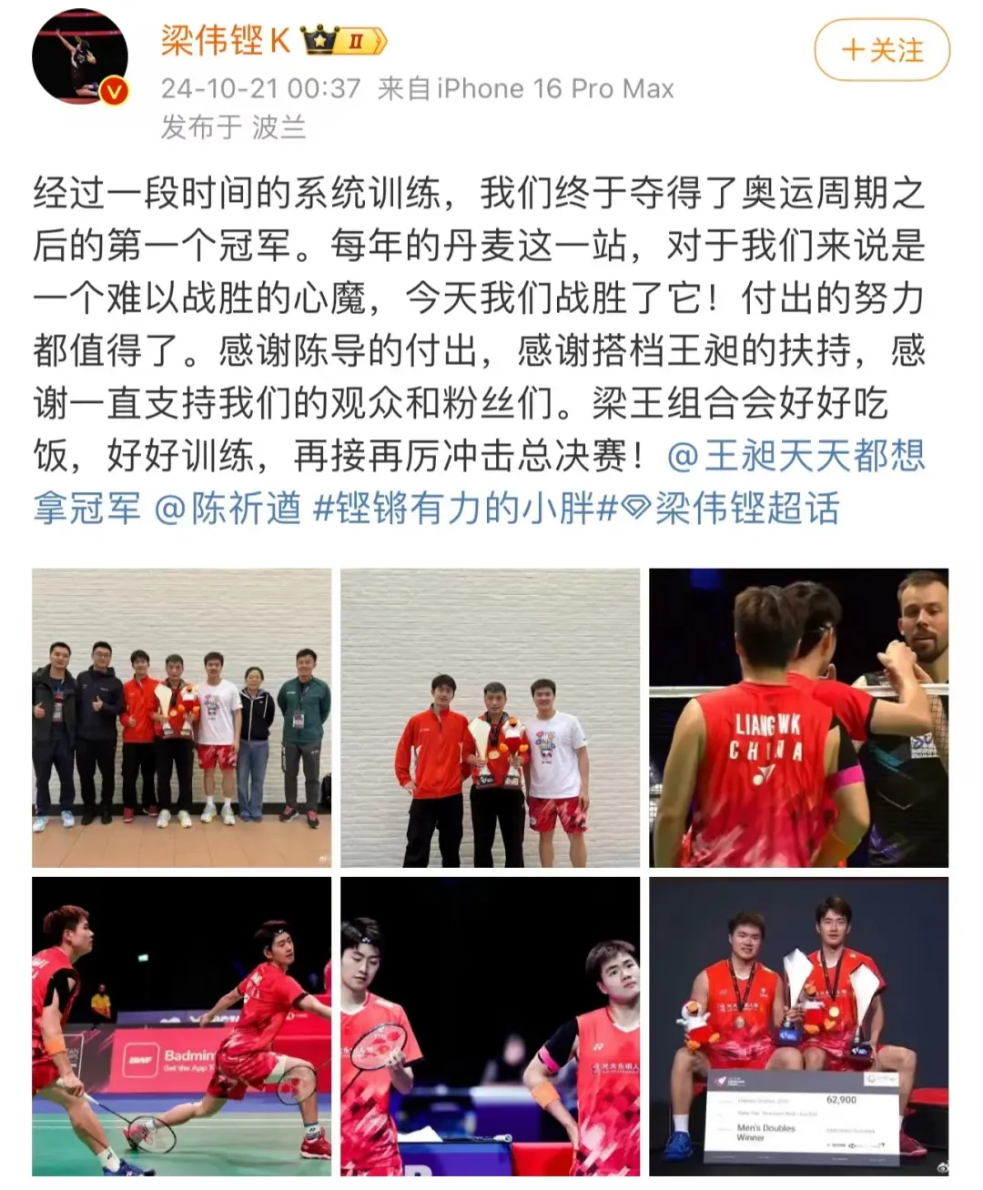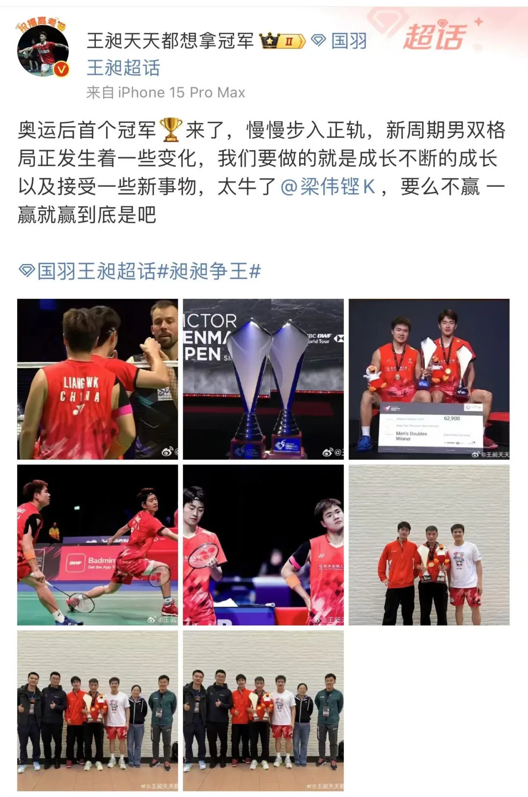 男双决赛中,中国组合梁伟铿/王昶21-18、21-17战胜丹麦组合阿斯特鲁普/拉斯姆森,这是他们巴黎奥运会后参赛收获的首冠,