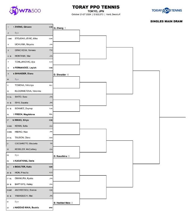 东京站比赛的签表显示,头号种子郑钦文将在首轮进行轮空,第二轮的潜在对手将在今年美网青少年女单冠军斯托伊萨夫列维奇和东道主球员内岛萌夏间产生。