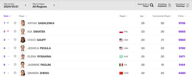 北京时间21日,国际女子网球协会(WTA)更新了最新一期世界排名。中国选手郑钦文积4480分排名第七,和上一周期持平。白俄罗斯名将萨巴伦卡排名上升至首位。此外,王欣瑜排在第39位,袁悦上升2位排名第44位、王雅繁上升3位排名第58……
