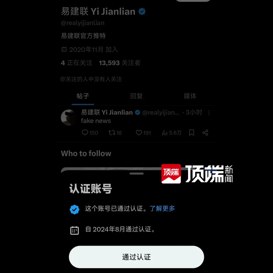 网传易建联外网回应页面多位“推特”用户告诉顶端新闻记者,该账号虽认证信息为“易建联官方推特”,但推特蓝标认证不等同于实名认证,是不是易建联本人账号有待考证。一在泰中国留学生解释说,推特通过邮箱认证,或一年缴费648元,即可成为会员并享有蓝标认证。