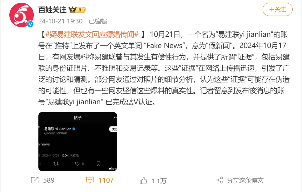 10月21日,媒体“百姓关注”发微博称,一个名为“易建联Yi Jianlian”的账号在外网社交平台“推特”上发布 “fake news”,意为“假新闻”。微博话题为“疑易建联发文回应嫖娼传闻”。