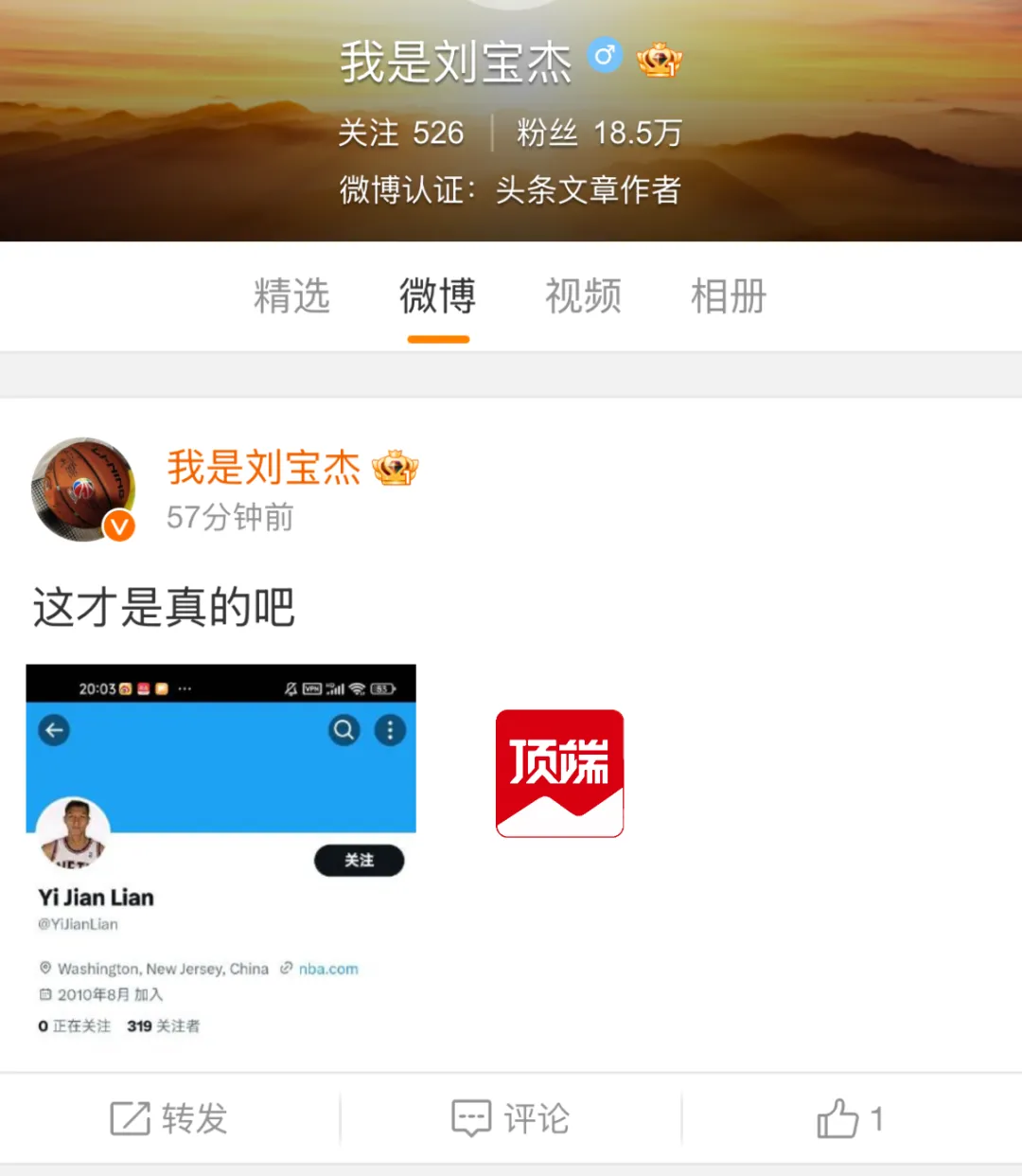 10月21日晚,微博认证用户@我是刘宝杰 也发文,晒出疑似易建联本人的推特账号并截图称“这才是真的吧”。截图账号为2010年8月注册,并在简介中链接了NBA官方网站。至于两个账号是否为易建联本人注册,目前仍无法确定。