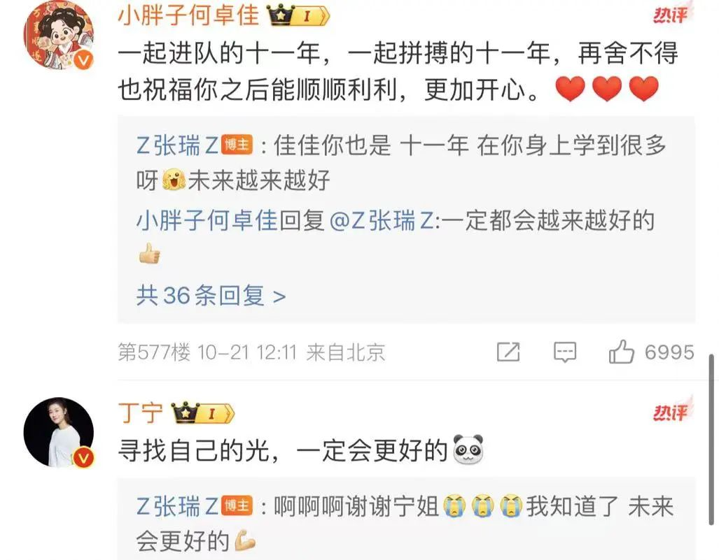 评论区中,乒乓球奥运冠军丁宁和中国乒乓球队队员何卓佳纷纷送上祝福↓