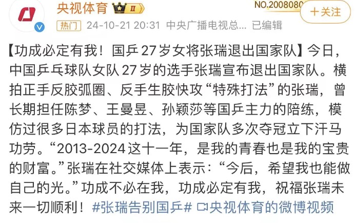 张瑞在告别感言中表示:“2013-2024,这是我的青春,也是我的宝贵财富。感谢中国乒乓球队,感谢一路帮助过我的恩师、教练和队友们,最后也感谢自己的付出。”