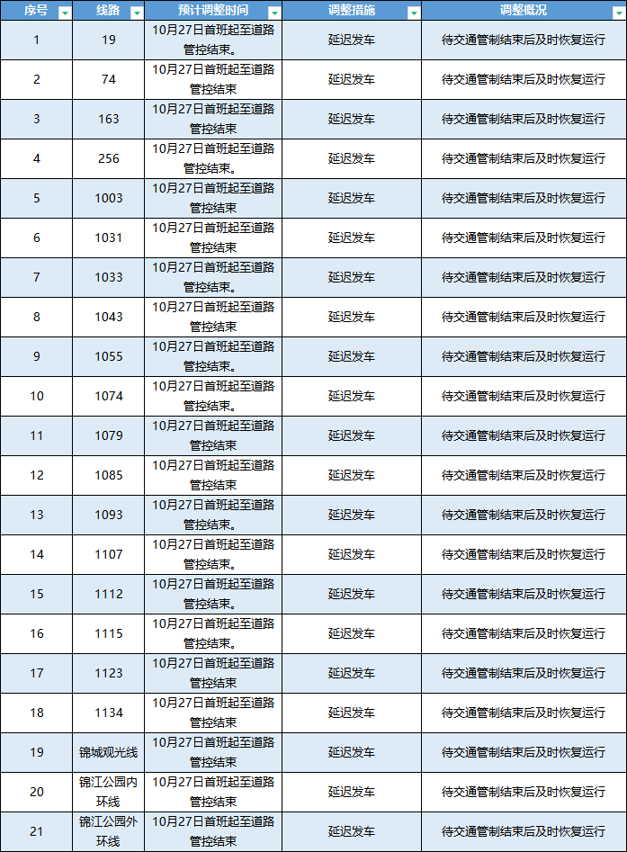 10月27日当日,为满足马拉松选手提前到场检录的出行需求,临时调整以下6条线路运营方案:
