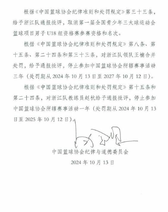 依据相关文件和规定,中国篮球协会纪律与道德委员会对浙江队给予通报批评、取消第一届全国青少年三大球运动会篮球项目男子U18组资格赛参赛资格和名次的处罚。此外,王楠被给予通报批评、停止参加中国篮球协会所辖赛事活动三年的处罚,赵杭被给予通报批评、停止参加中国篮球协会所辖赛事活动一年的处罚。