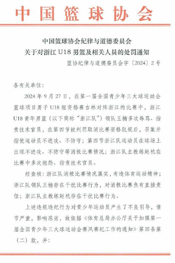关于浙江U18男篮的处罚通知称,9月27日,在第一届全国青少年三大球运动会篮球项目男子U18组资格赛吉林队对阵浙江队的比赛中,浙江U18青年男篮领队王楠多次辱骂、指责技术官员,在第四节被判罚取消比赛资格犯规后,召集并指使运动员不进攻、不防守;第四节浙江队运动员在球场上出现不进攻、不防守等消极比赛情况;浙江队主教练赵杭在比赛中多次抱怨、指责技术官员。经查核,浙江队消极比赛情况属实,有违体育运动精神;王楠存在干扰比赛行为,对消极比赛负有直接责任;赵杭存在干扰比赛行为。