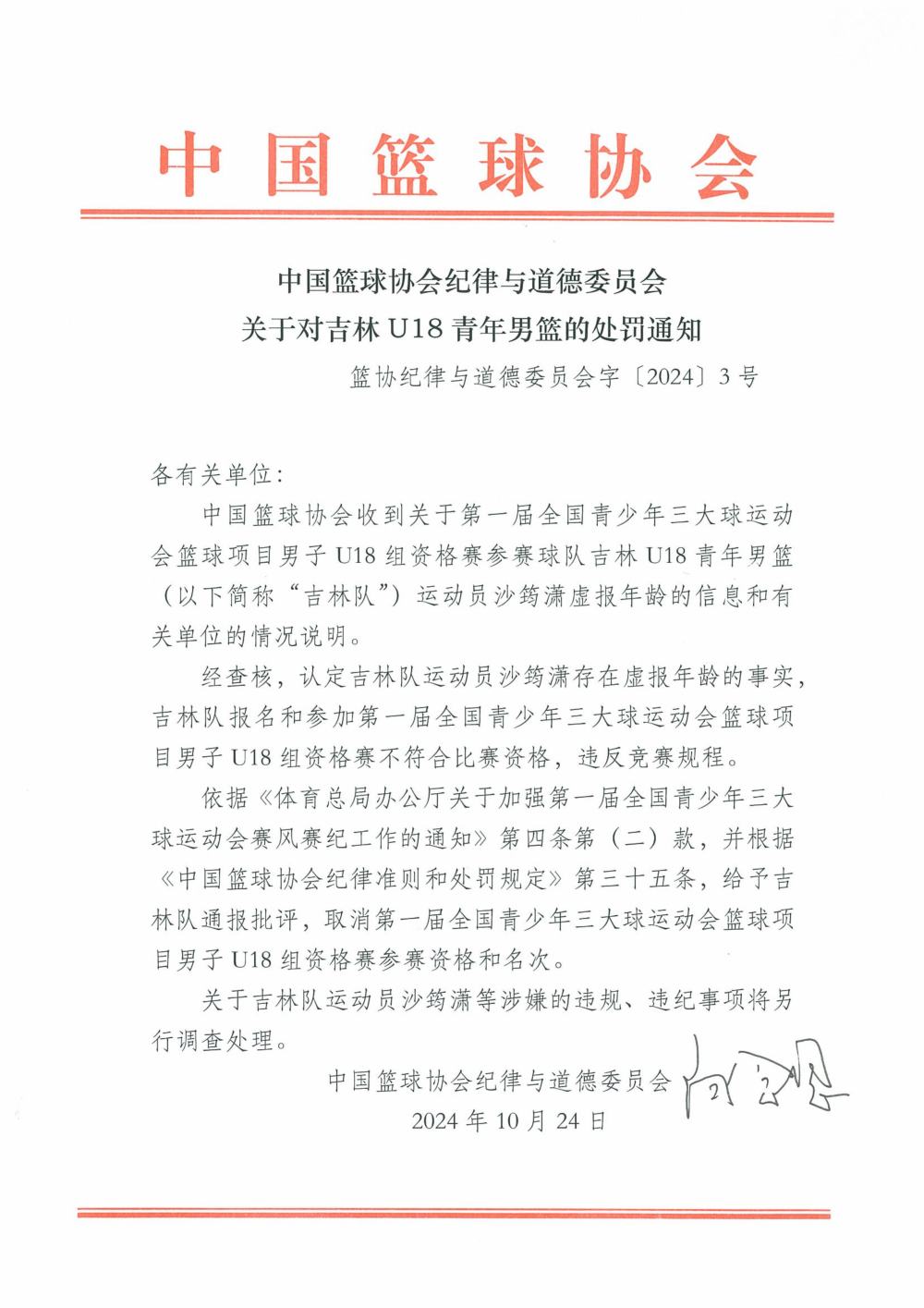 中国篮协纪律与道德委员会在关于吉林U18男篮的处罚通知中表示:“经查核,认定吉林队运动员沙筠潇存在虚报年龄的事实,吉林队报名和参加第一届全国青少年三大球运动会篮球项目男子U18组资格赛不符合比赛资格,违反竞赛规程。”依据有关文件和规定,中国篮协纪律与道德委员会给予吉林队通报批评、取消第一届全国青少年三大球运动会篮球项目男子U18组资格赛参赛资格和名次的处罚。关于沙筠潇等涉嫌的违规、违纪事项将另行调查处理。
