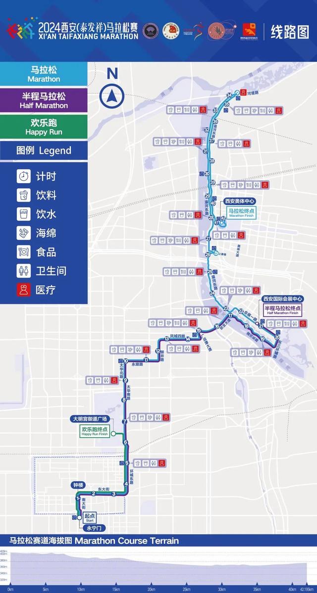 全程马拉松路线:永宁门东侧盘道(起点)→南大街→钟楼盘道→东大街→长乐门盘道→环城东路北段→太华南路→太华北路→永顺路→御井路(逆行)→永隆路→浐灞三路→广运潭大道→欧亚大道→灞河东路→东三环北侧辅路→会展一路→欧亚大道→灞河东路→上善巷→上善巷折返处(折返)→上善巷→灞河东路(逆行)→灞河东路与河堤路南侧折返处(折返)→灞河东路(逆行)→西安奥体中心西广场南侧道路→西安奥体中心体育场(终点)