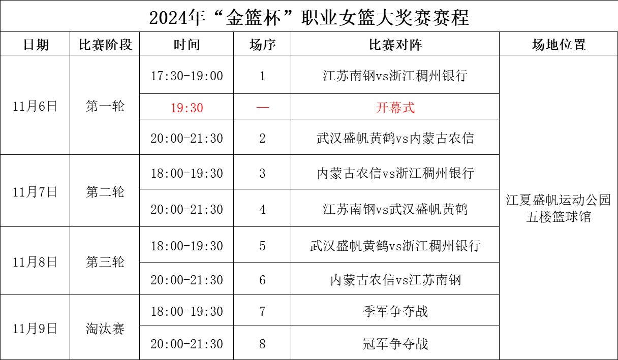 此次赛事分为循环赛和排位赛两个阶段,6日至8日,四队两两厮杀、积分排序。9日由循环赛阶段的1至2名争夺冠、亚军,3至4名争夺季军。参赛队伍除了三外援齐备的东道主武汉盛帆黄鹤女篮,还有两届WCBA总冠军内蒙古女篮、WCBA四强常客江苏女篮以及上赛季位列第5的浙江女篮,可谓是众星云集、群英荟萃。