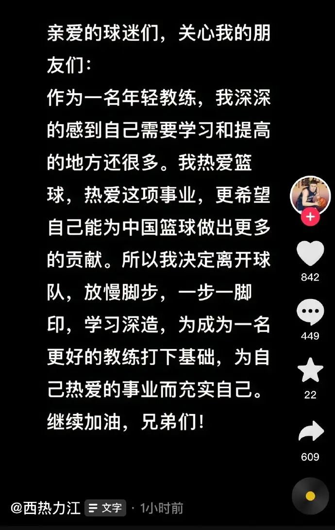 同曦主帅西热力江凌晨宣布离队:放慢脚步 充实自己