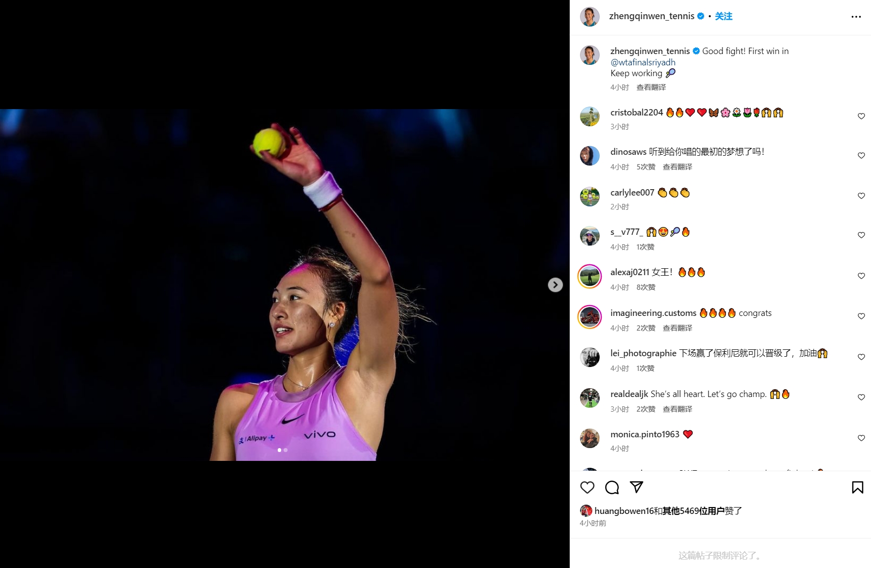 郑钦文写道:“很棒的战斗!在利雅得WTA年终总决赛的首场胜利。继续努力!”