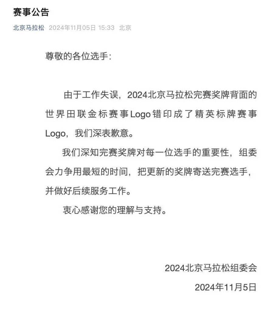 11月5日下午,2024北京马拉松组委会发布公告,就完赛奖牌背面的世界田联锦标赛事Logo错印成精英标牌赛事Logo一事向参赛选手致歉。同时组委会也表示,将尽快将正确版本的奖牌寄送补发给所有完赛选手。