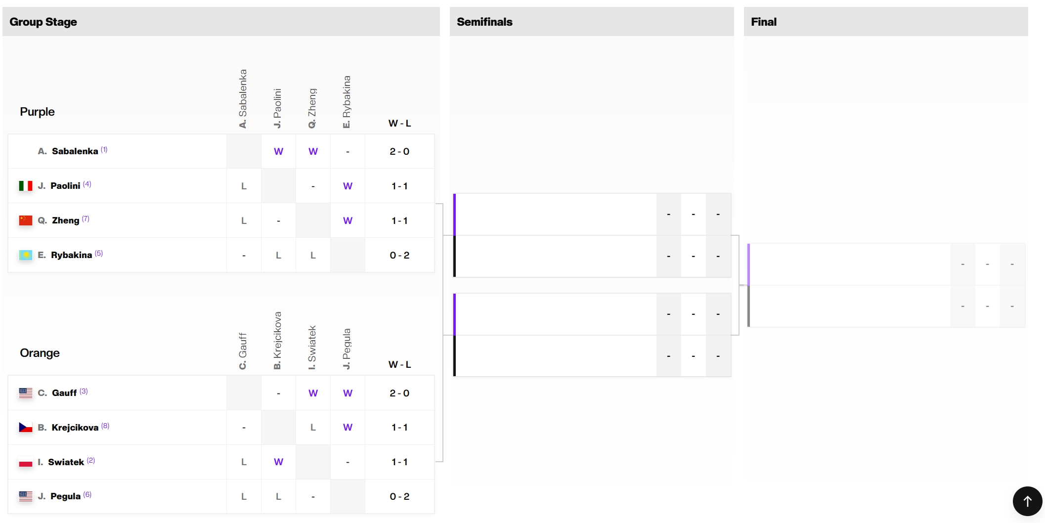 从紫组出线的郑钦文将在半决赛中与橙组第一交锋,半决赛具体对阵将在明日小组赛全部结束后确定。