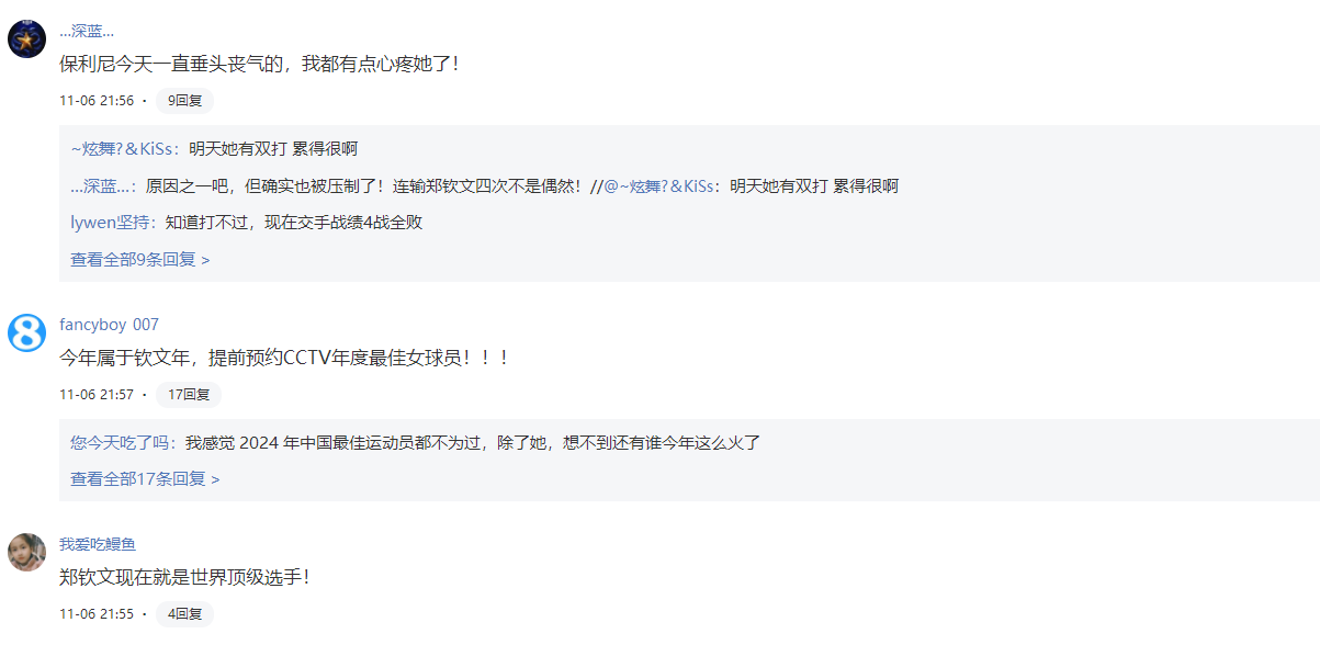 郑钦文也成为了继2013年的李娜之后,第二位从年终总决赛出线的中国网球女单选手。