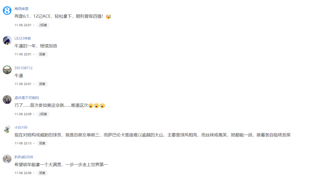 北京时间11月6日晚,WTA年终总决赛,郑钦文小组赛2胜1负出线,首次参赛就晋级4强。