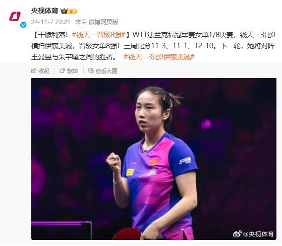 WTT法兰克福冠军赛女单1/8决赛,钱天一3比0横扫伊藤美诚,晋级女单8强!三局比分11-3、11-1、12-10。下一轮,她将对阵王曼昱与朱芊曦之间的胜者。