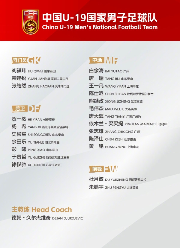 在这份大名单中,门将刘骐玮、袁建锐、张皓然入选;后卫球员有贺一然、杨希、史松宸、余田乐、彭啸、于贵哲、徐俊驰;中场球员为白余涛、唐瑞、王一凡、陈仕晗、熊继政、毛伟杰、唐天翼、依木兰·买买提、张志雄、陈泽仕、黄铭;前锋为杜月徵和朱鹏宇。根据赛程,单循环的小组赛,中国队将在第1轮对阵卡塔尔,第2轮对阵吉尔吉斯斯坦,第3轮对阵澳大利亚。
