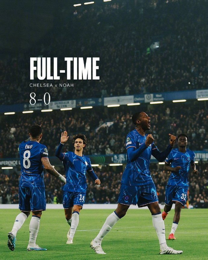 全场比赛结束,切尔西8-0诺亚FC,欧协联三战全胜进16球排积分榜第1!