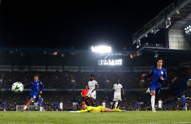 11月7日,切尔西队球员菲利克斯(前右)在比赛中射门得分。新华社/路透