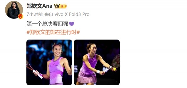 郑钦文更新社媒动态,分享两张照片,并写道:“第一个总决赛四强💜”